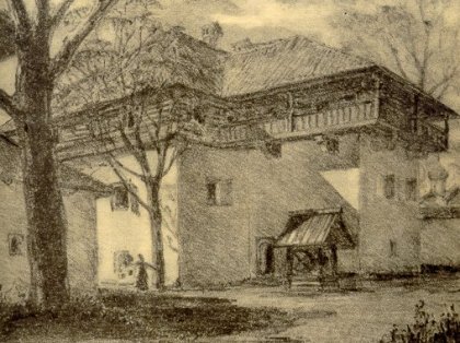 Четвертый этаж был уже полностью деревянным. В его сени, помещавшиеся над сенями нижележащего каменного этажа, поднимались из повалуши по внутренней лестнице. По сторонам сеней размещались горницы: ближе к улице - мужской части семьи, в стороне, обращенной в глубь участка, - женской.